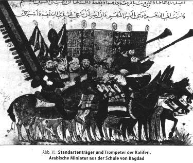 Abb 10: Standartenträger und Trompeter der Kalifen. Arabische Miniatur aus der Schule von Bagdad