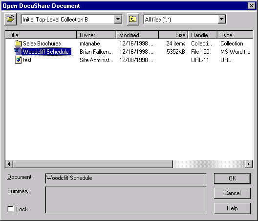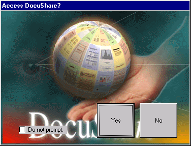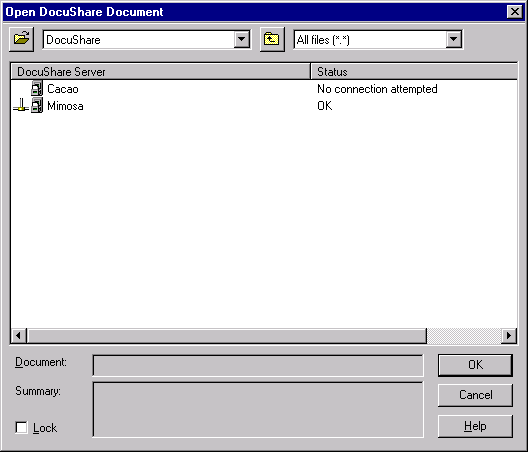 - If you choose No, the standard Microsoft Word Open dialog box appears, letting you browse Explorer to select the file you wish to open. If you choose Yes, a dialog box for DocuShare opens as shown below: