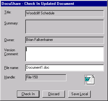 When you are finished editing a document using the ODMA Client, you may save the file locally on your computer or check the updated file back into DocuShare. Think of checking the file in as returning it. Save alone will not check the file back in to DocuShare. Follow the steps below to check in an edited file to DocuShare.