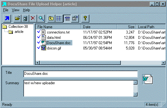 To add (or upload) a file to the DocuShare repository when using a web browser that is not file upload enabled (Microsoft Internet Explorer 2.0 or 3.0) you must have the DocuShare File UpHelper application installed on your computer. See DocuShare UpHelper in Chapter 1 for installation instructions. Users of upload-capable browsers can also use this application to upload files, especially if they wish to upload multiple files to the repository.
