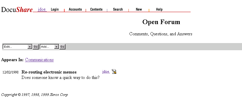 Just as in other DocuShare objects, the Edit Location command allows a user to move a DocuShare bulletin from one bulletin board to another or allows the bulletin to appear in multiple bulletin boards within the DocuShare repository. There is only one physical copy of the bulletin in the DocuShare database; the system simply creates additional pointers or references to it.